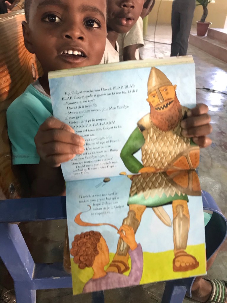 Last week, a generous donation arrived with a team of illustrated Children’s Bibles in Haitian Creole. And this week’s Kids Life class had every wiggly child engaged, flipping through the pages, following along with the stories.