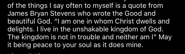 And that is why I put all my big hope in Jesus. And peace fills my soul. It doesn’t always fill my emotions, and I have to hunt for strawberries. (I think that used to just be called counting your blessings.) But, I do have an inner joy that runs deeper than I can explain because it doesn’t come from me. It is a gift from my Father God.